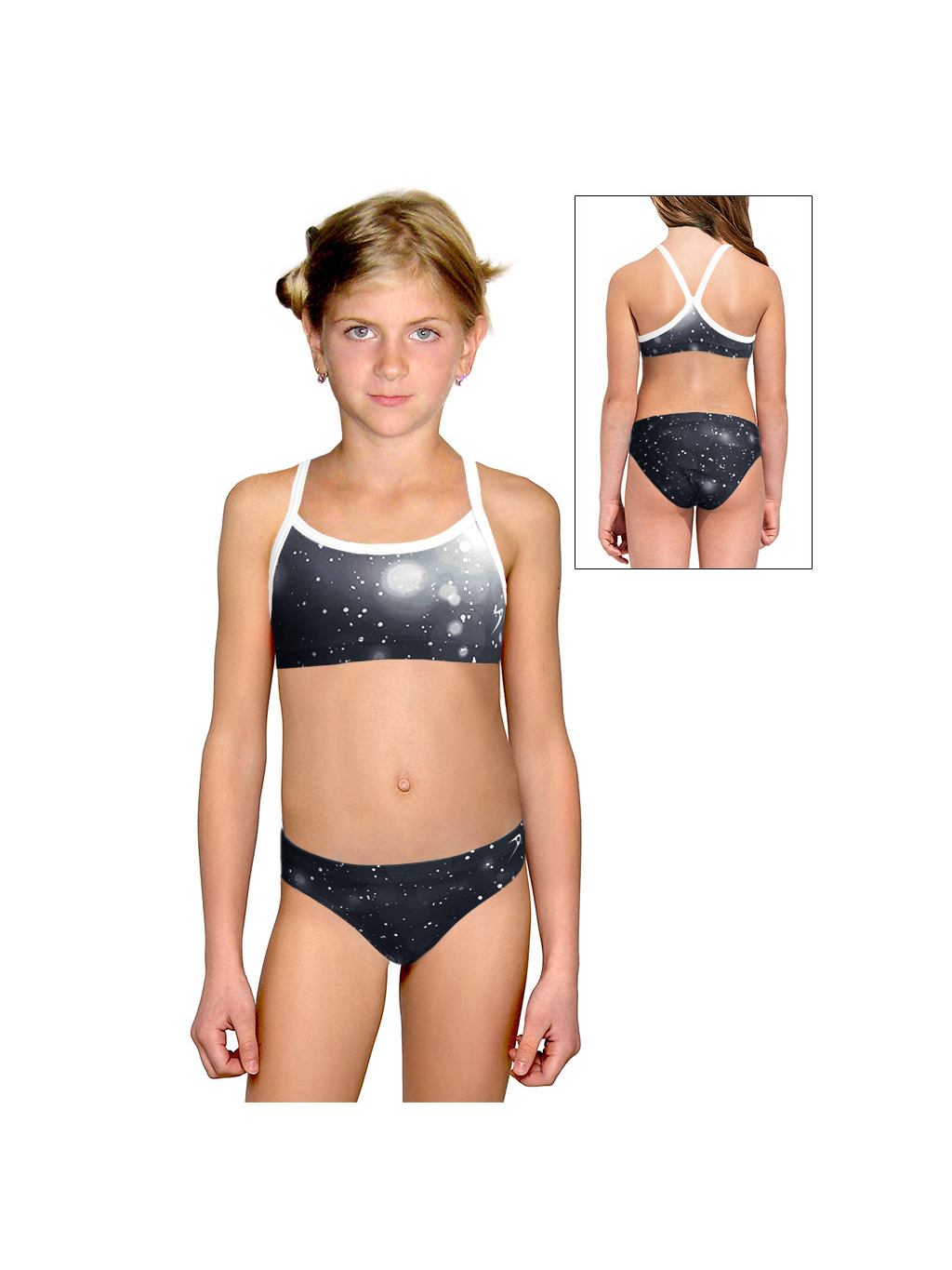 Tyto dívčí dvoudílné sportovní plavky mají tenká ramínka a vykrojená záda, která nabízejí naprostou volnost pohybu. V pase a ve spodní části horního dílu je širší guma, díky které plavky drží pevně na svém místě.