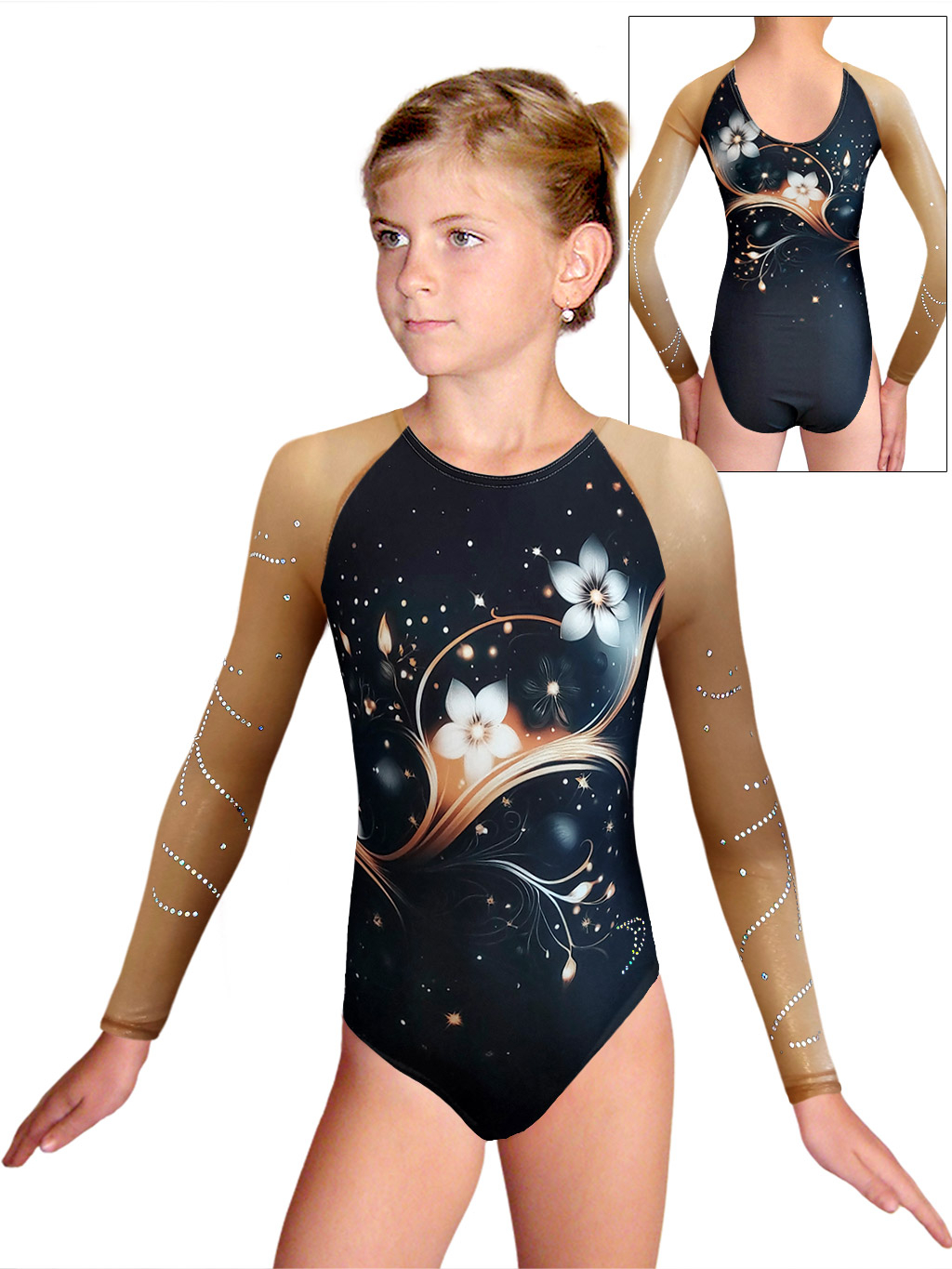 Gymnastický dres D37d-9 t253 F167r černobéžová s tylovými rukávy