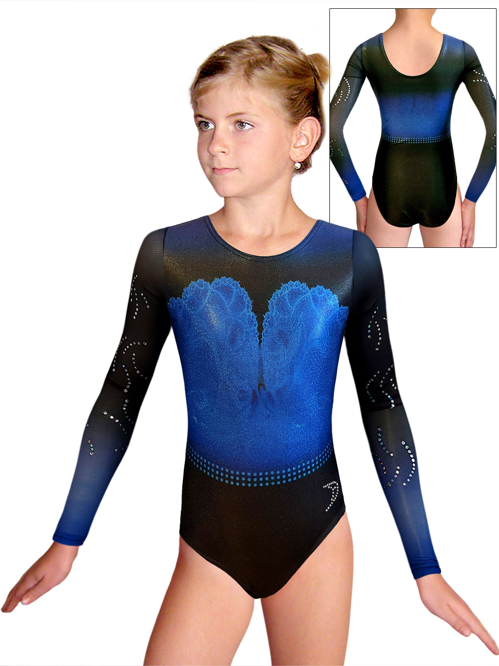 - gymnastický dres je z velmi efektní třpytivé metalické plavkoviny s digitálním potiskem, která je pružná a přizpůsobí se tak každé postavě