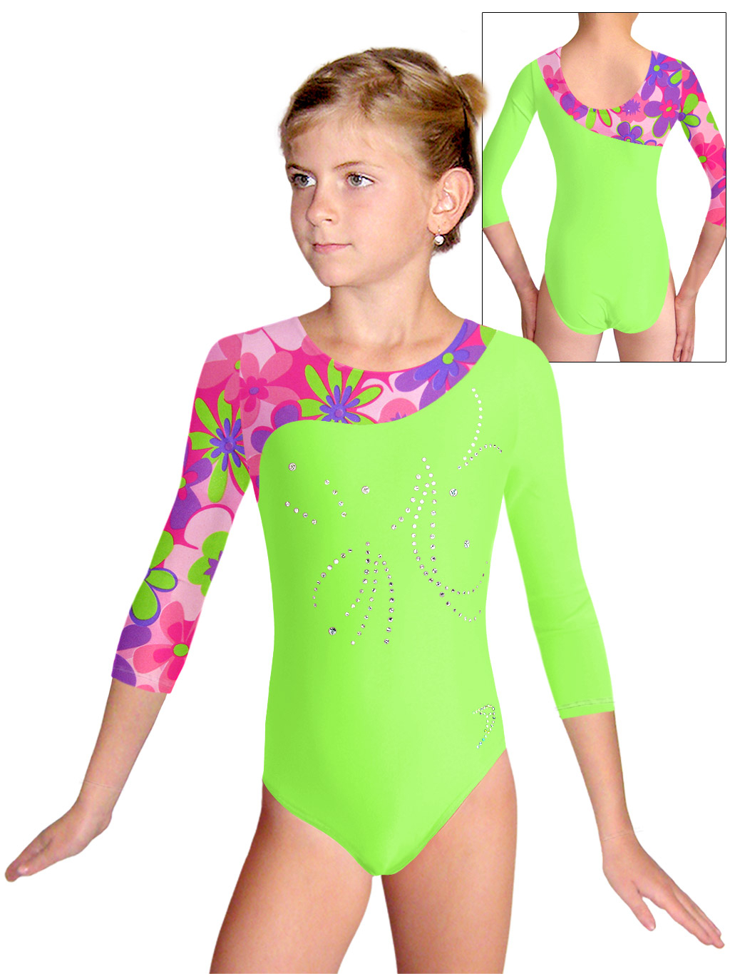 - dres je ozdobený motivem z nažehlovacích flitrů. Flitry dobře drží, při cvičení netlačí a mají vysoký duhový lesk.