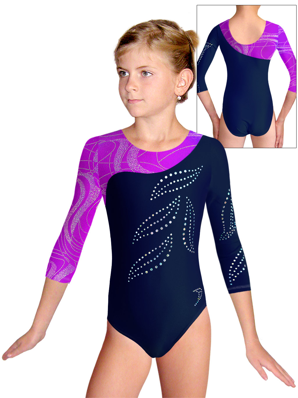 • dres je ozdobený motivem z nažehlovacích flitrů. Flitry dobře drží, při cvičení netlačí a mají vysoký duhový lesk.