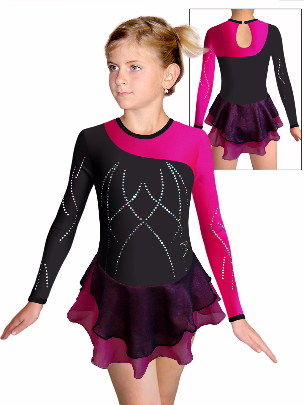 - šaty jsou ozdobeny motivem z nažehlovacích flitrů. Flitry dobře drží, při cvičení netlačí a mají vysoký duhový lesk