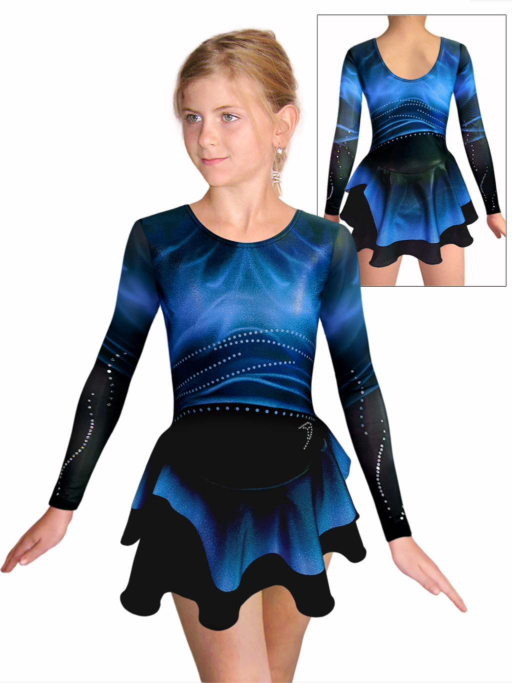 - šaty jsou na rukávech ozdobeny motivem z nažehlovacích flitrů. Flitry dobře drží, při cvičení netlačí a mají vysoký duhový lesk