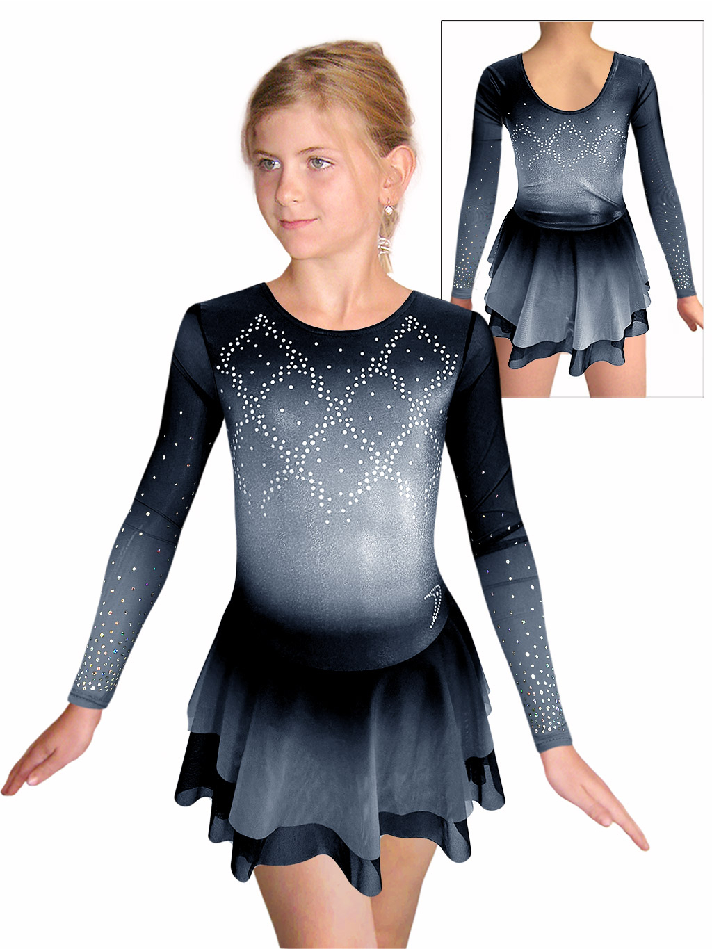 - šaty jsou na rukávech ozdobeny motivem z nažehlovacích flitrů. Flitry dobře drží, při cvičení netlačí a mají vysoký duhový lesk