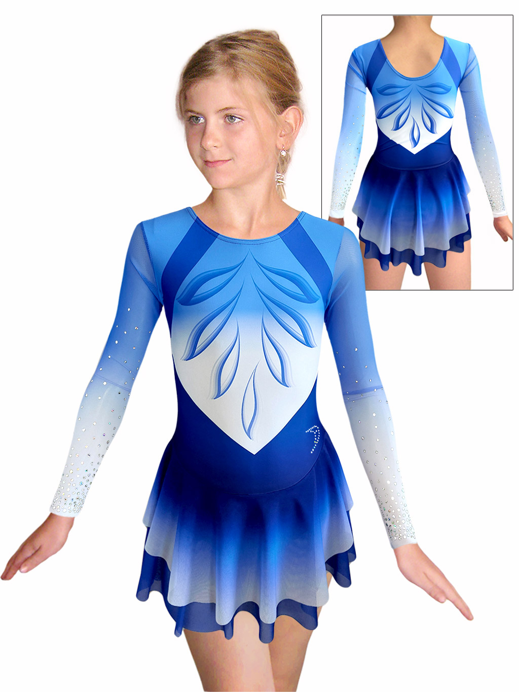 - šaty jsou na rukávech ozdobeny motivem z nažehlovacích flitrů. Flitry dobře drží, při cvičení netlačí a mají vysoký duhový lesk